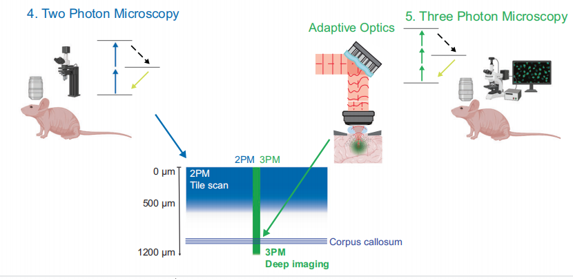 深層組織成像(>1 mm深度)的難題在于光的散射和衰減。兩光子顯微一般在大腦皮層300–700 μm左右逐漸力不從心。近年最大的突破來自于三光子顯微技術,配合優(yōu)化的飛秒激光光源,使在毫米級深度的活體成像成為可能。